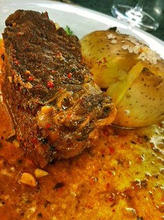 Pra acompanhar, provei o Altus Merlot 2007, que foi muito bem com a carne. É um vinho encorpado, que apesar da idade ainda mostrava-se jovem tanto na cor quanto nos aromas doces, lembrando frutas, chocolate e um pouco de pimenta branca. Na boca tem taninos bem vivos e acidez bem presente, que foram bastante necessárias para segurar a gordura da carne.